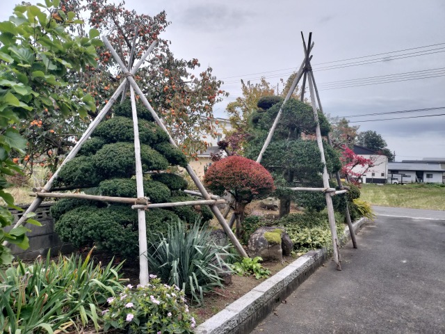 昨年までは紅葉が終わってから雪囲いを行っていたが、寒い中での作業が辛くなり、紅葉が隠れない骨組みを行った。