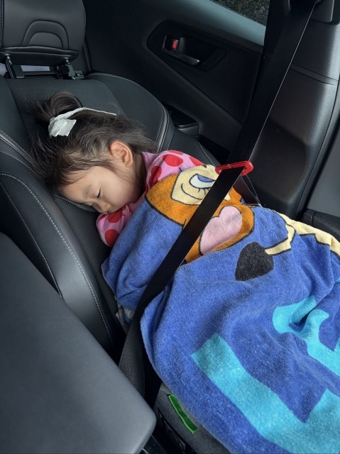 遊び疲れて車の中でぐっすり