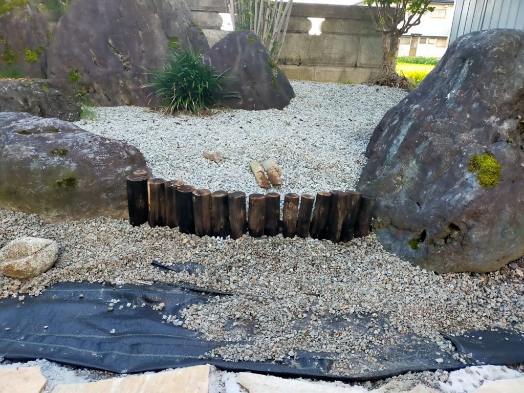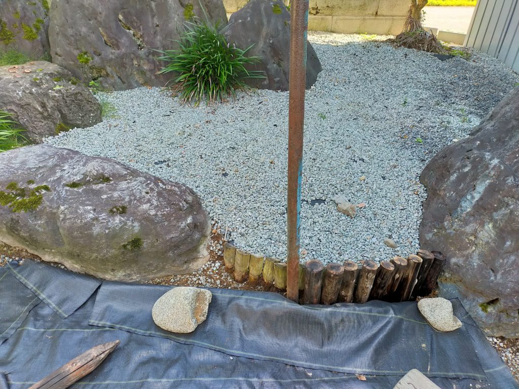 今まではこの部分は防草シート無であったので、今後草取りが楽になる予定。