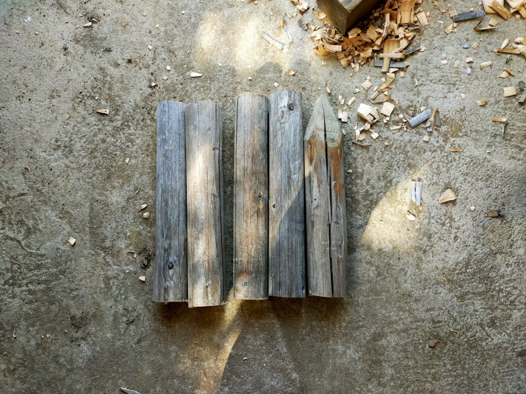 杭が腐らないようにバーナーで焼いて土留め用の杭の出来上り。